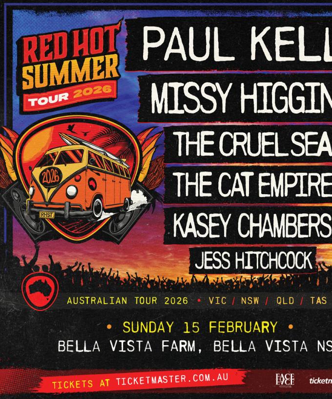 Red Hot Summer Tour is heating up in 2026, headlined by Paul Kelly and with a spectacular line-up featuring Missy Higgins, The Cruel Sea, The Cat Empire, Kasey Chambers, and Jess Hitchcock.